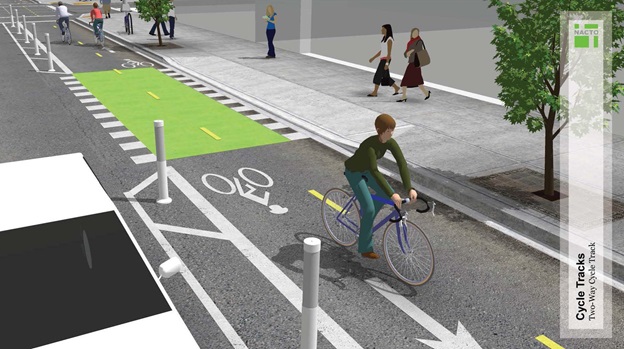 The two-way cycle tracks will be painted green and will be separated from vehicular traffic by parked cars, flex posts or grade variations. The 9.3 miles of cycle track in the Downtown Mobility Plan accounts for 16.5% of the total downtown street network.