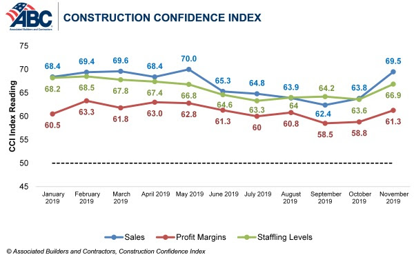 Confidence among U.S. construction industry leaders increased in November 2019 with respect to sales, profit margins and staffing, according to the Associated Builders and Contractors Construction Confidence Index.