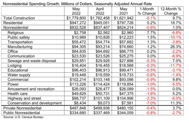 National non-residential construction spending was down by 0.6% in May, according to an Associated Builders and Contractors (ABC) analysis of data published by the U.S. Census Bureau.