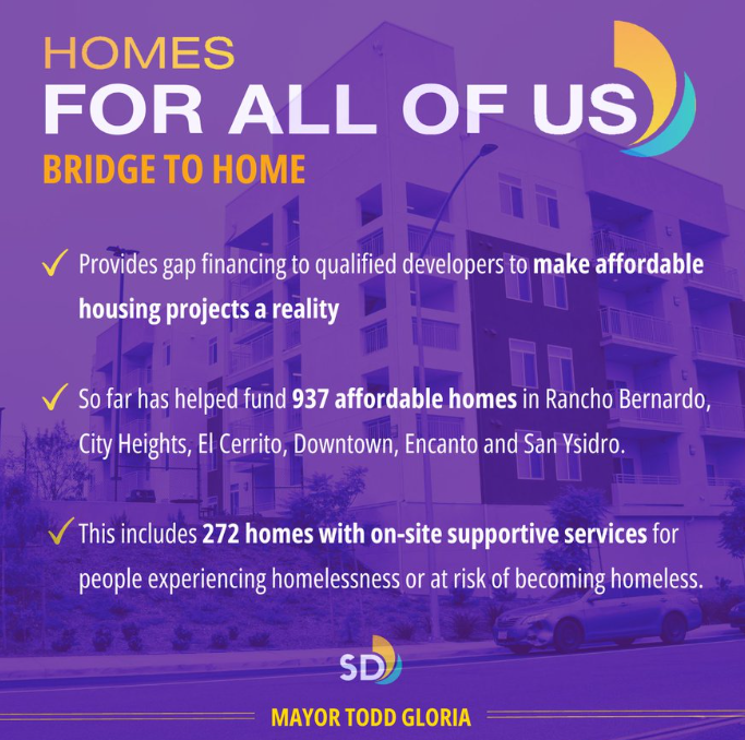 “I have not let up on my commitment to make it easier and less expensive to build homes that are affordable for struggling residents,” Mayor Todd Gloria said. “This third round of Bridge to Home will help builders get their projects off the ground and result in hundreds of new affordable homes for San Diegans.”