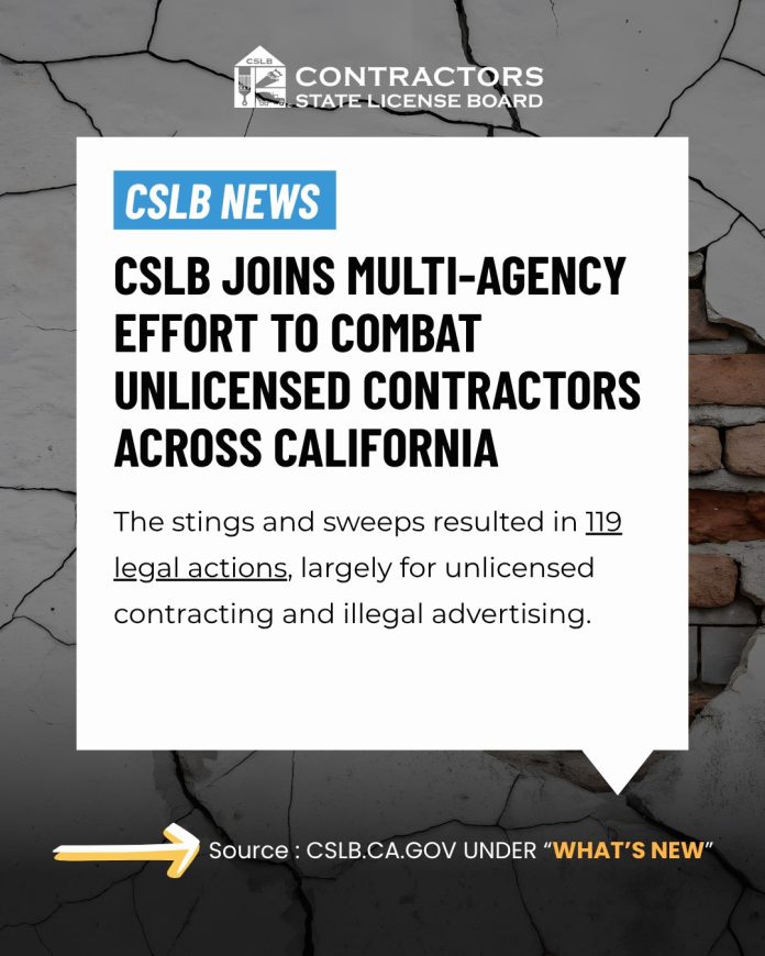 The California Contractors State License Board (CSLB) has completed a two-week series of coordinated stings and jobsite sweeps across the state, resulting in 119 legal actions targeting unlicensed contracting and illegal advertising in the construction industry.
